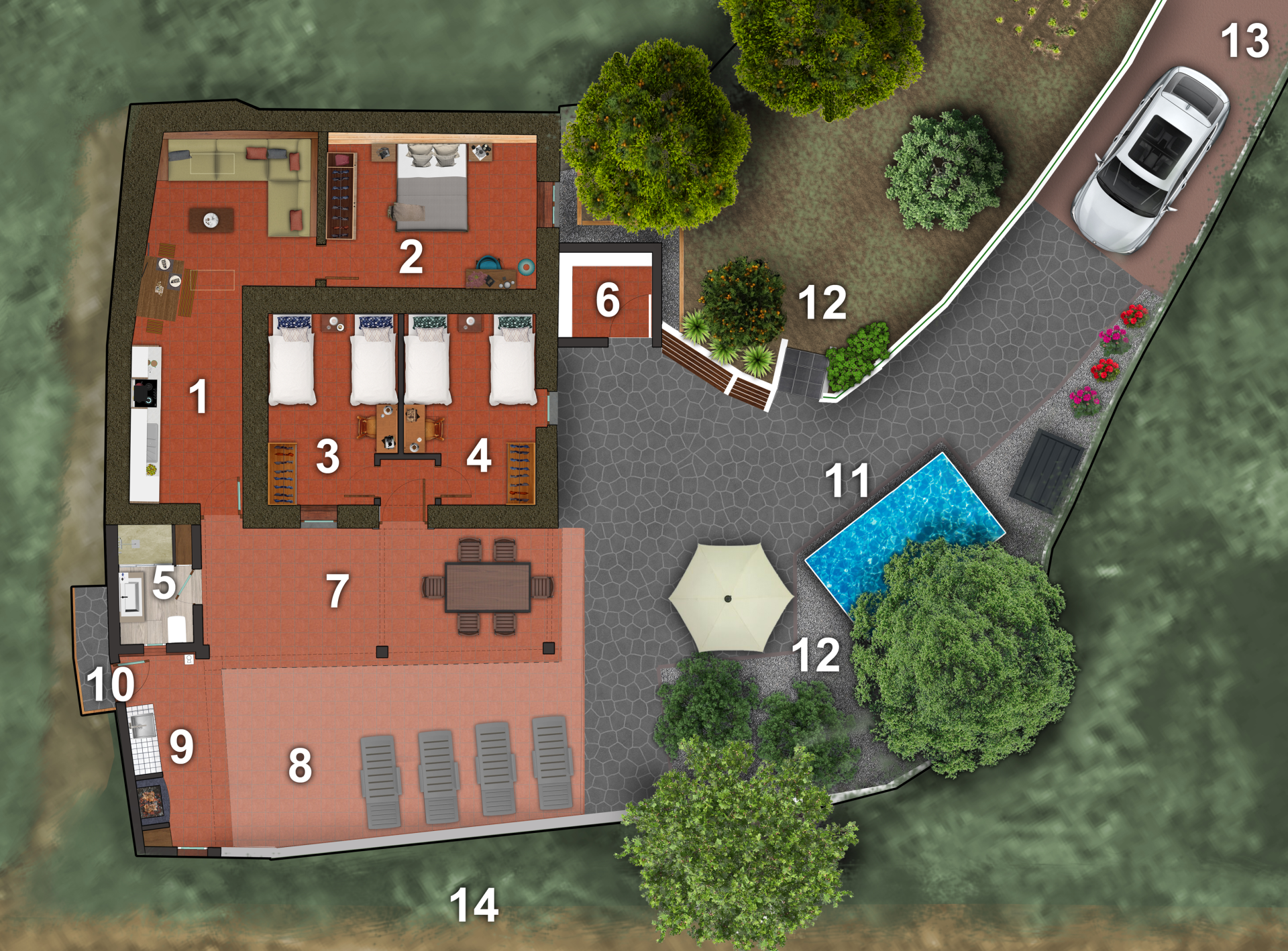 Vivienda y exteriores. 1 Salón comedor Cocina -2 Dormitorio -3 Dormitorio -4 Dormitorio -5 Baño -6 Cuarto de aperos -7 Porche cubierto -8 Terraza -9 Barbacoa -10 Acceso posterior -11 Piscina tubular elevada -12 Frutales -13 Aparcamiento -14 Camino